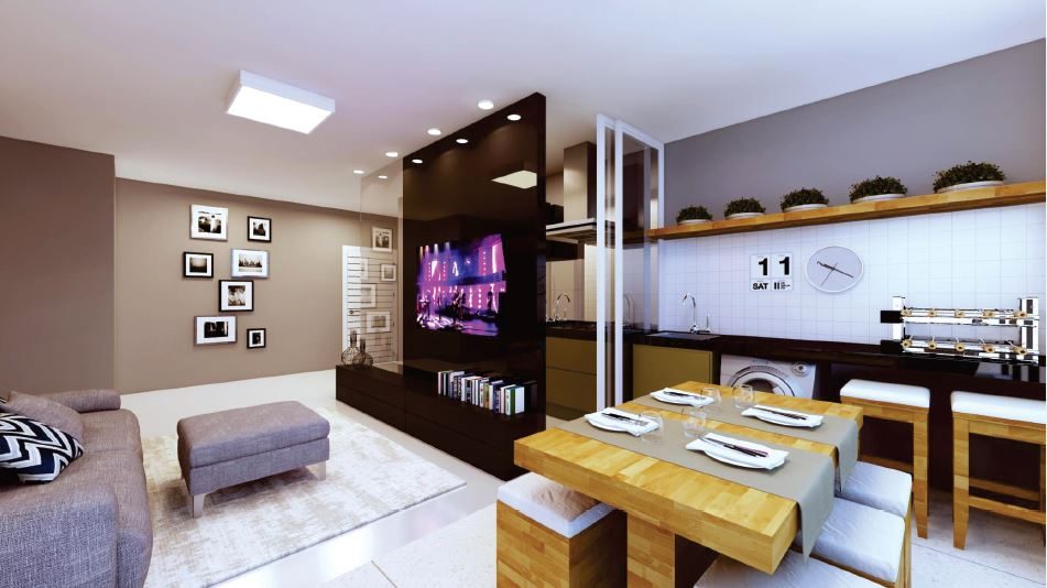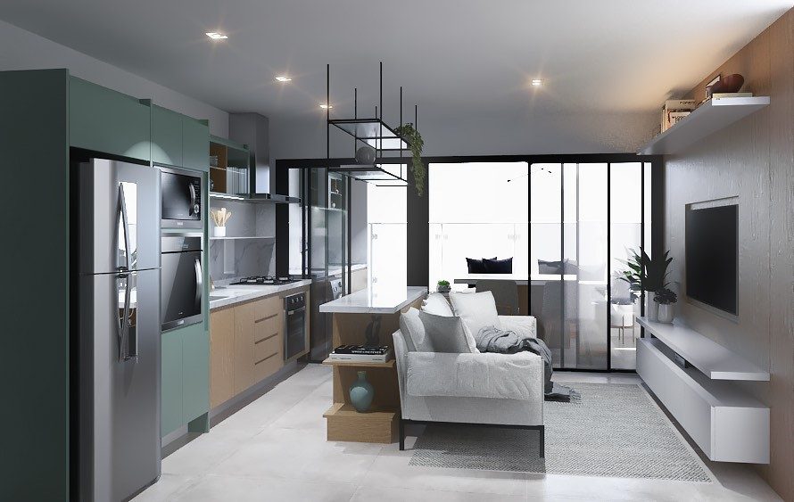 O projeto versátil traz este novo conceito de morar bem, adequando-se as suas necessidades com sugestão de: 2 dormitórios (sendo 1 suíte), opção home theater + cozinha americana, opção home office ou opção studio.
